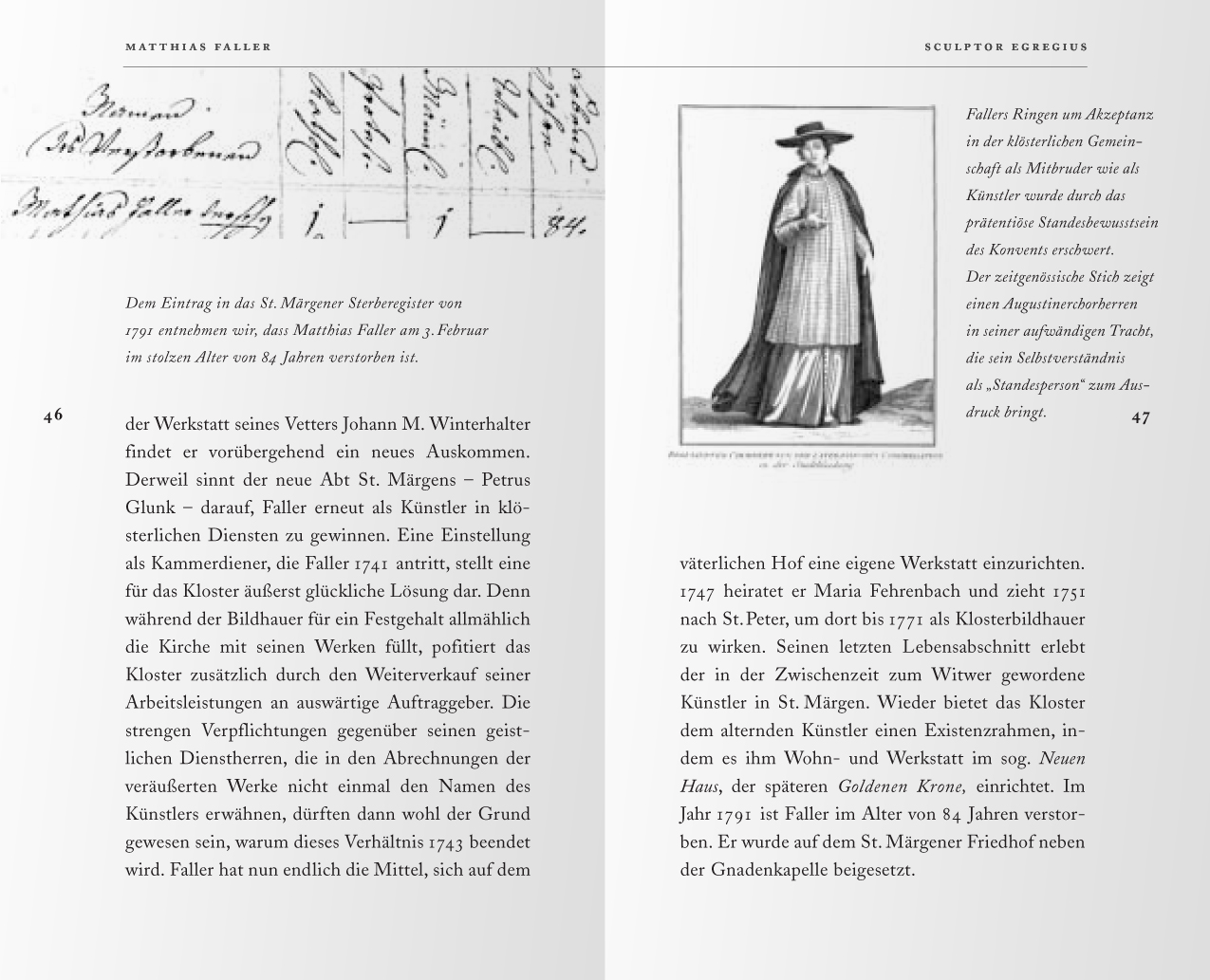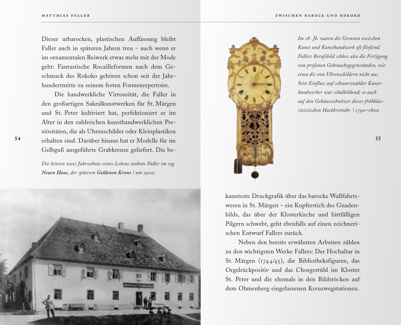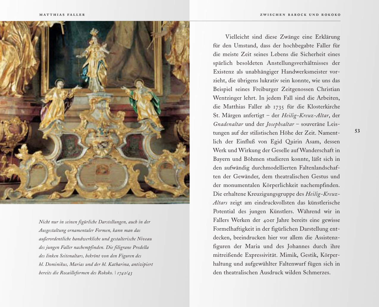 Das typographische Konzept des Kunstführers „St. Märgen – Eine Spurensuche….“ : Die ganze Palette von Schnitten einer Barockantiqua wird für die unterschiedlichen Textebenen genutzt. Damit die detailverliebten Formen der Schrift ihre ganze Wirkung entfalten können, wird bewußt ein großzügiger Abstand von kurzen Zeilen gewählt. Der Wortabstand im Blocksatz bleibt kompakt. (nach unten scrollen)