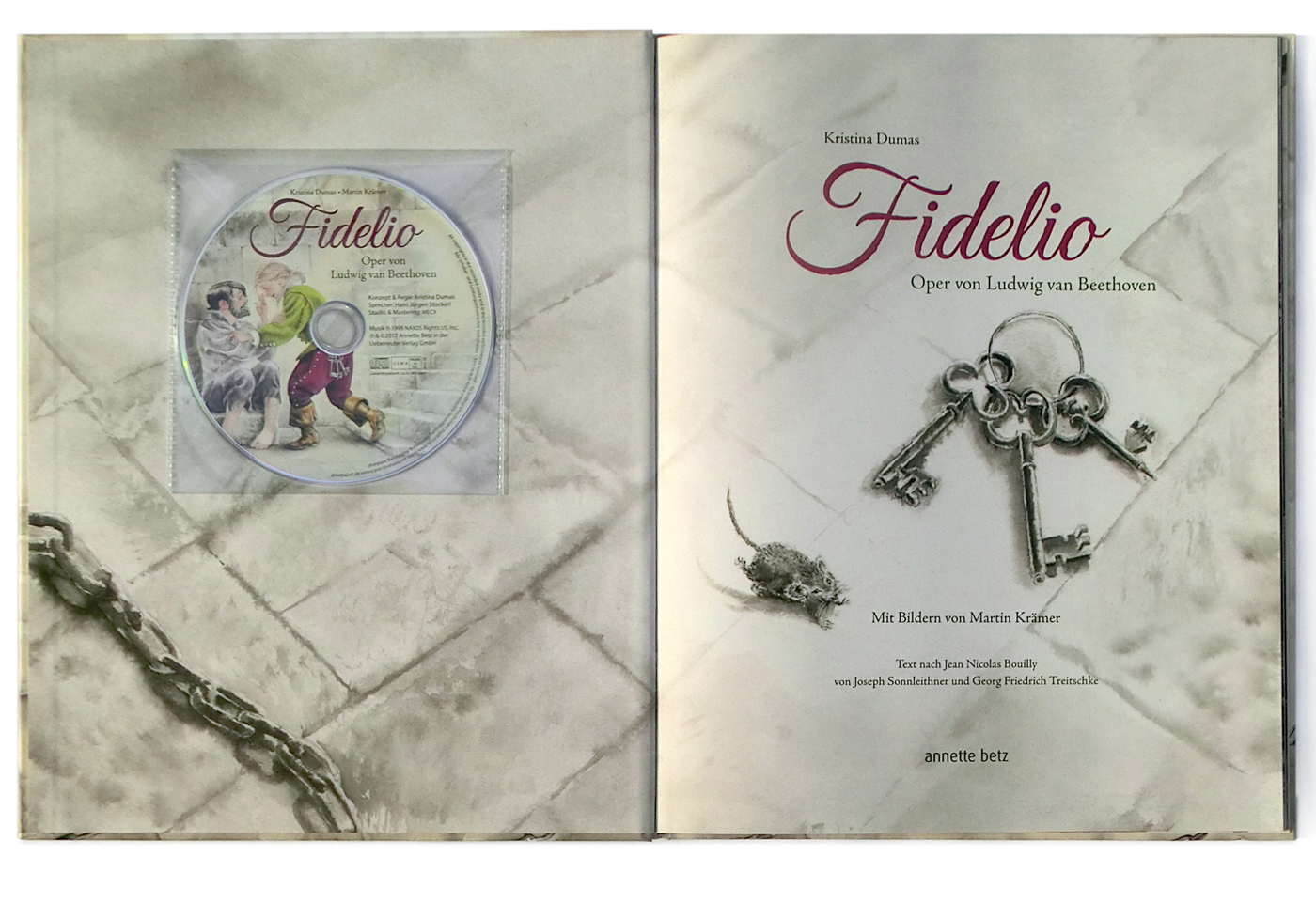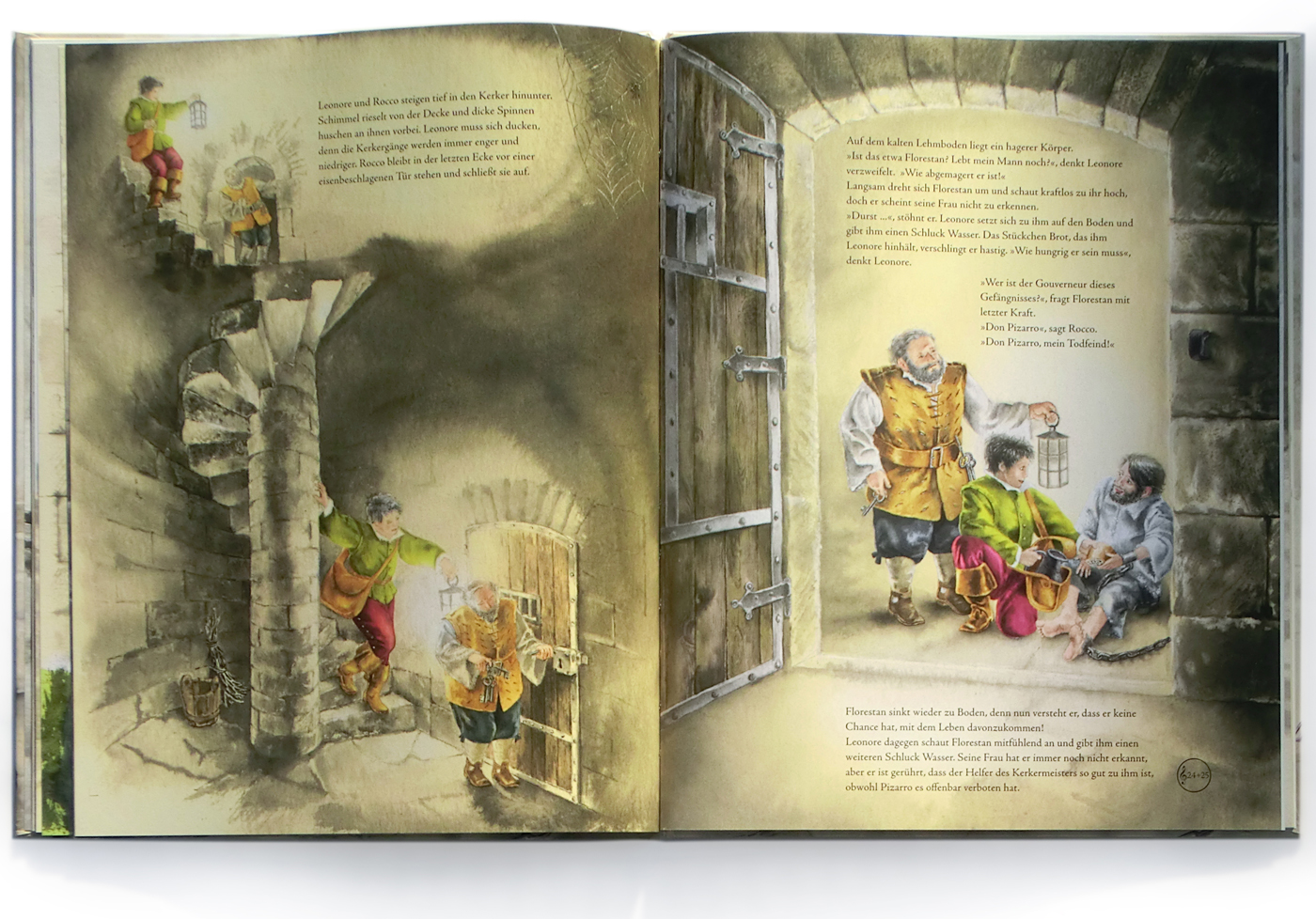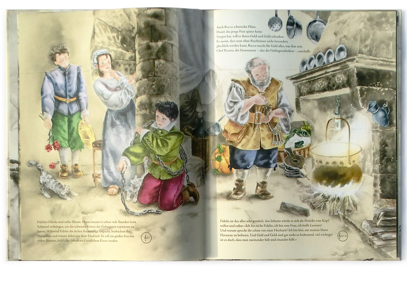 Der Annette-Betz-Verlag macht durch aufwändig illustrierte Bücher Kindern die Welt der Oper verständlich. In großformatigen doppelseitigen Aquarellen wird die Geschichte der tapferen Leonore erzählt, die als Fidelio verkleidet ihren Mann Florestan rettet. (nach unten scrollen)