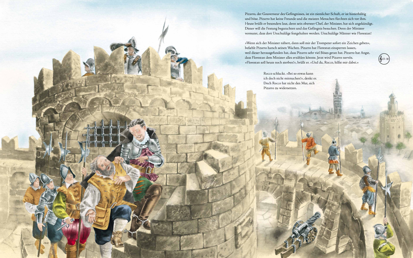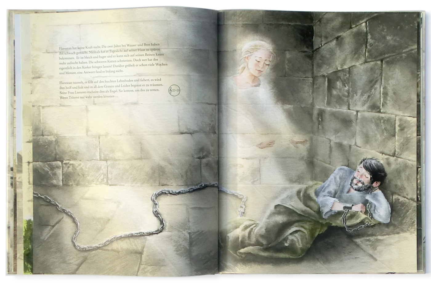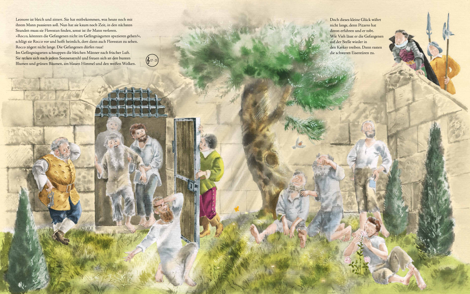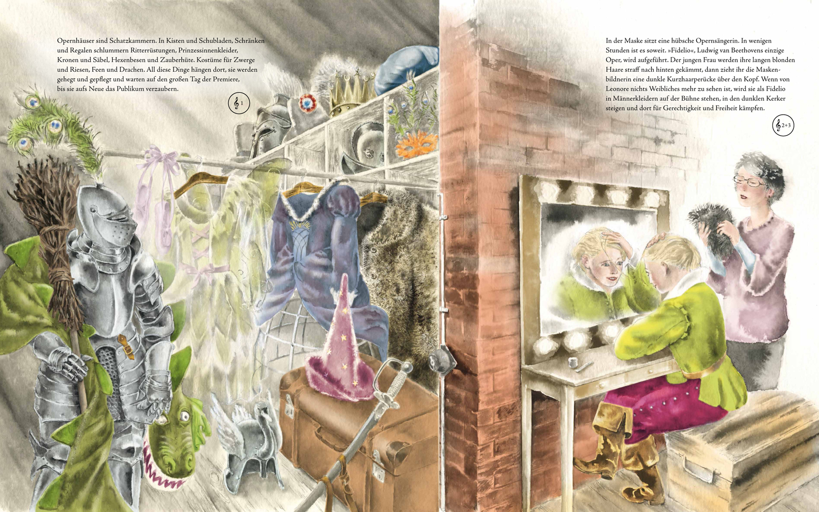 Der Annette-Betz-Verlag macht durch aufwändig illustrierte Bücher Kindern die Welt der Oper verständlich. In großformatigen doppelseitigen Aquarellen wird die Geschichte der tapferen Leonore erzählt, die als Fidelio verkleidet ihren Mann Florestan rettet. (nach unten scrollen)